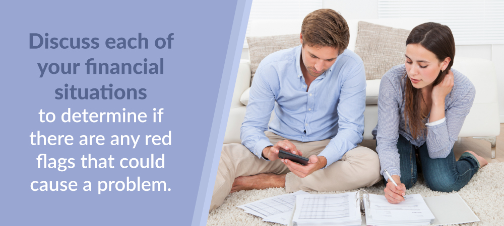 Money isn't everything, but entering into a marriage when your finances are messy sets the union off on rocky footing. Discuss each of your financial situations to determine if there are any red flags that could cause a problem.