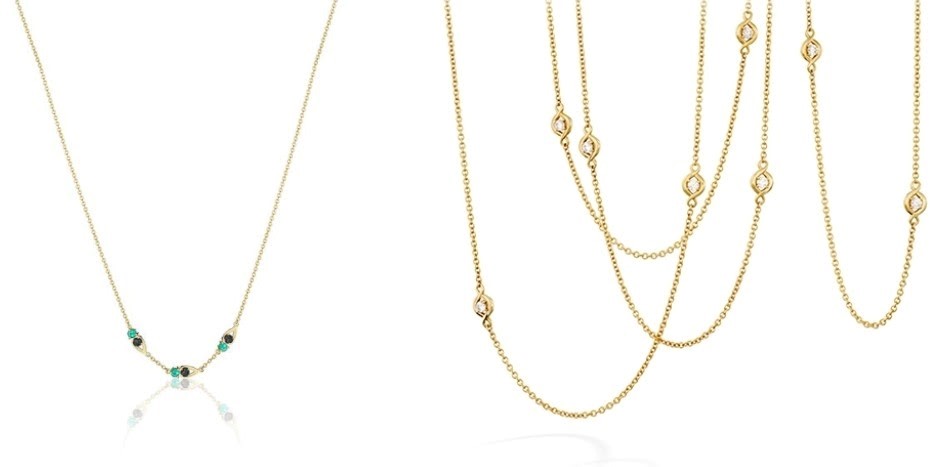 Find out the combination of lengths and layers that suit you best. You want the gradations to appear neat and put together. Aim to separate your layers by about 2 inches’. You can gauge from here whether you’d like them closer or farther apart. You can make them a little closer for specific styles, especially with chains like this Hearts On Fire Optima Station Necklace featuring 18k yellow gold.